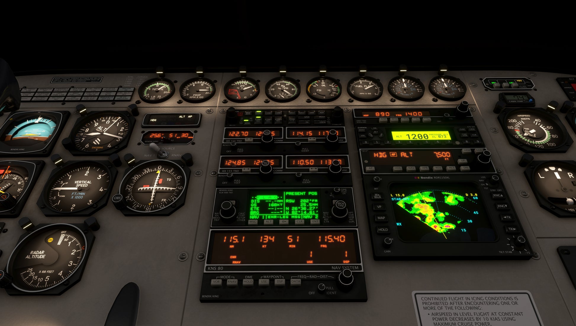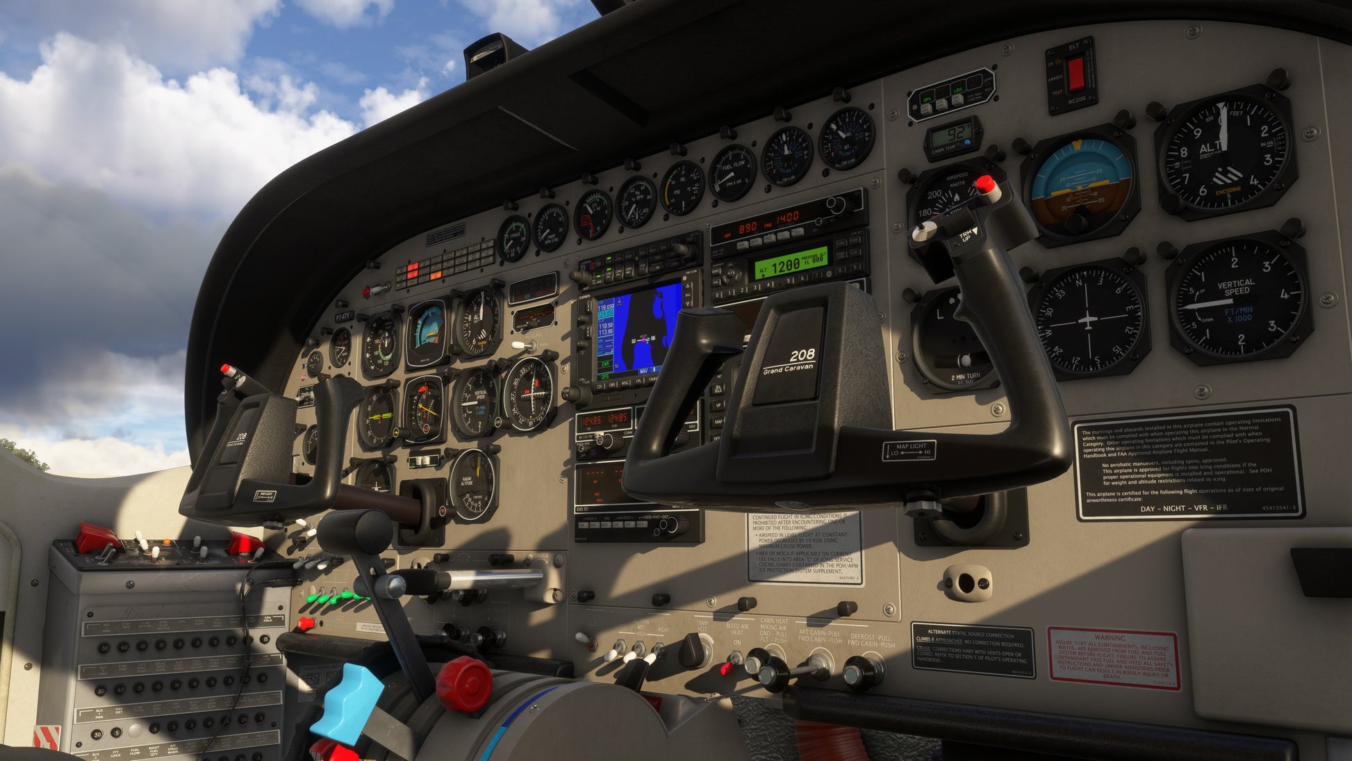 Radio navigation systems are available from several eras of the C208’s history. Fly without GPS via a Bendix KNS-80 RNAV system, or with the convenience of a Garmin GTN 750/650 (PMS50 or TDS). Other radio equipment includes KX-155 radios, KLN-90B, GNS 530/430, KFC 150 Autopilot and an RDR1150XL Weather Radar. A 145+ page manual provides instruction on all equipment, and 42 in-game checklists with control highlighting are included for normal and emergency procedures.
