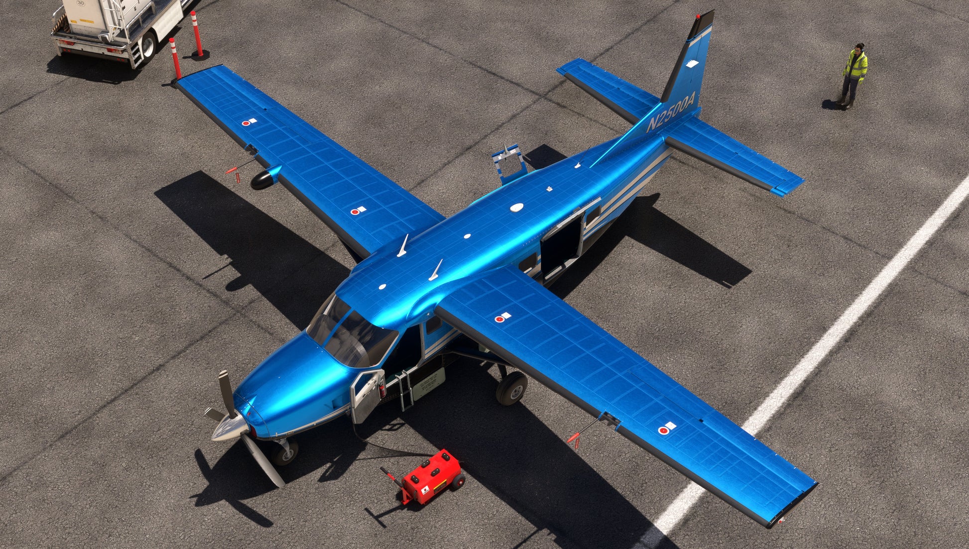 - NEW - Functional exterior elements (interactive in MSFS 2024) and control locks: chocks, pitot covers, engine covers, rudder lock and ground power cart. Pitot flags blow in the wind.